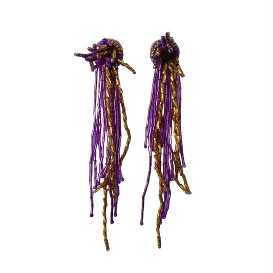Beaded Dangle Fringe Earrings, Purple & Gold