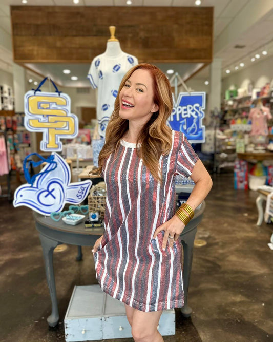Sequin Stripe Shirt Dress, Garnet & Gold