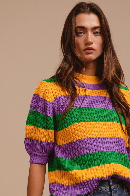 Mardi Gras Stripe Short Sleeve Knit Sweater