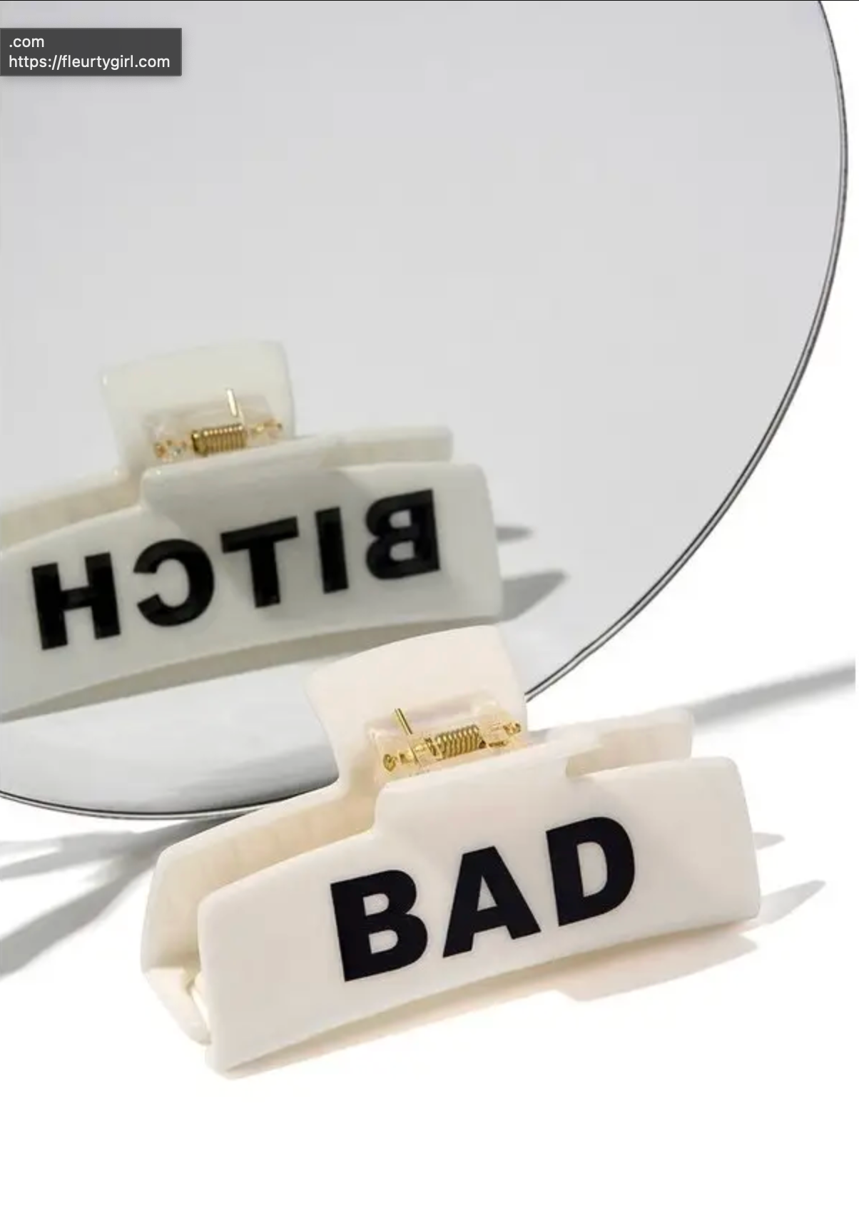 White hair claw clip that reads bad on one side and bitch on the other.