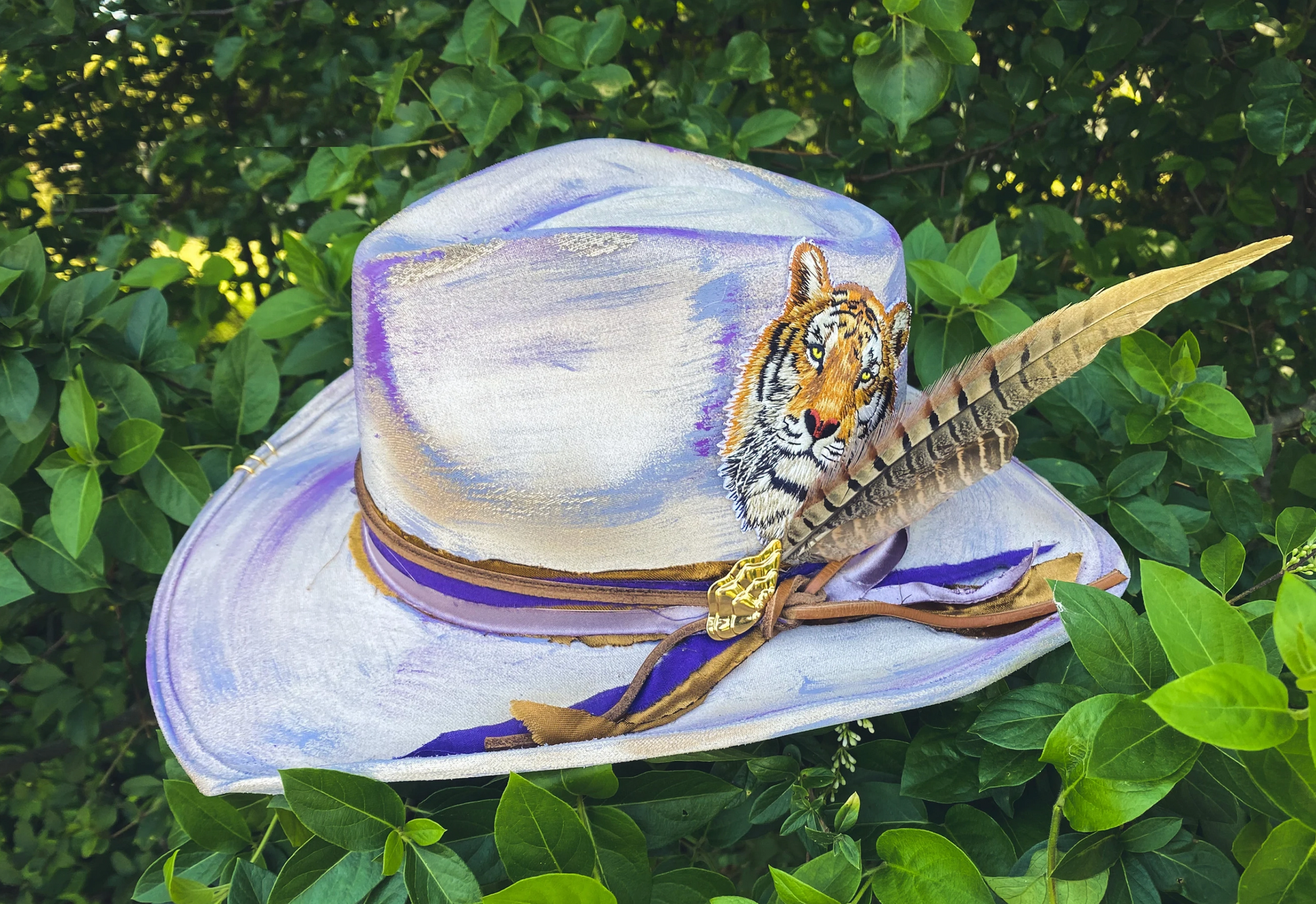 Adjustable felt flat brim rancher hat you absolutely need! Hand painted and distressed with purple and gold, tiger head patch, gold metallic tipped feather, unique buttons & bands to cheer on our Tigers in one of a kind style!! No two are the same, so they may not look just like the ones pictured. *this item is available as a pre-sale that should ship around 9/30*