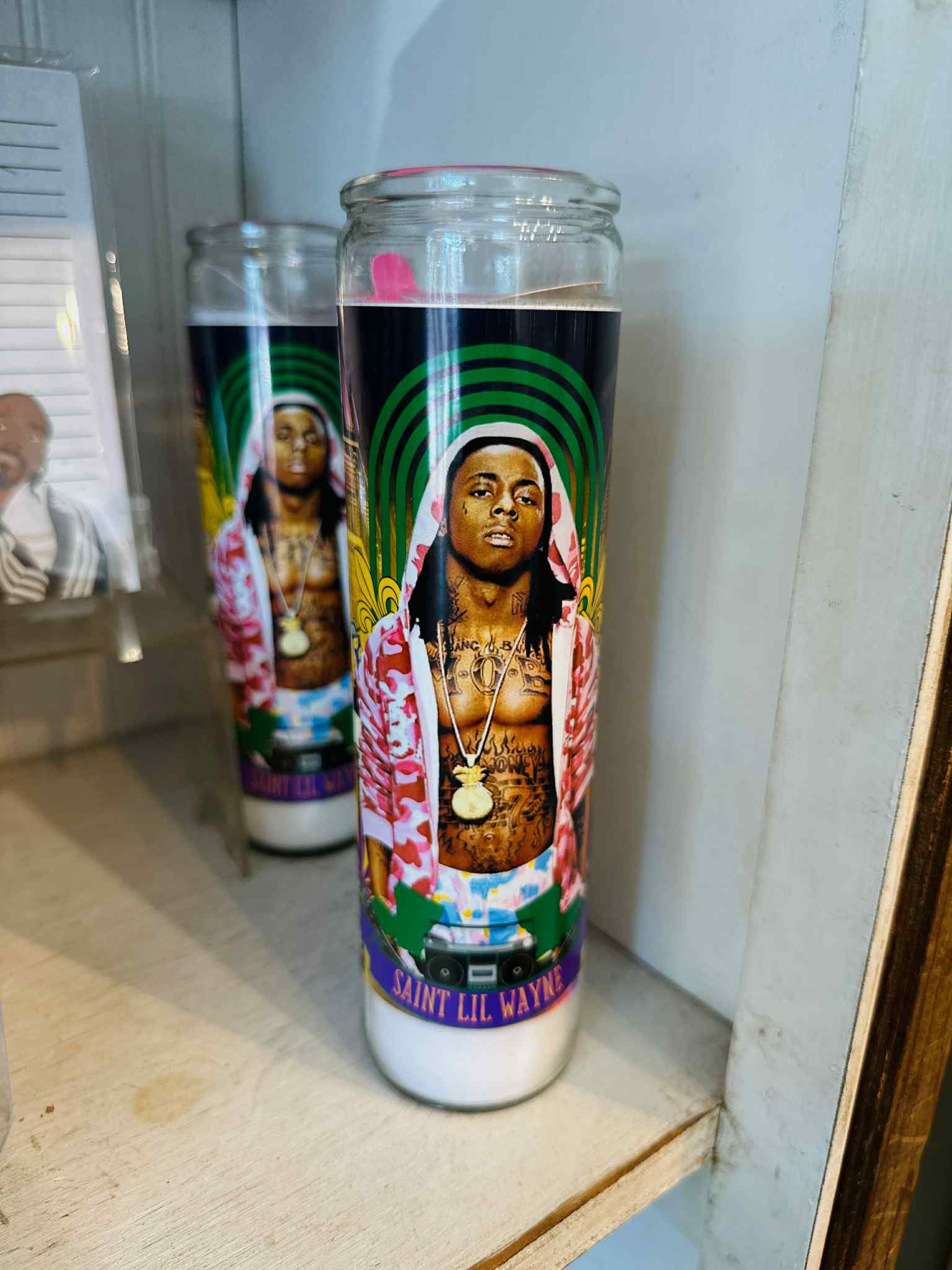 Tall white altar/ prayer candle featuring the Patron Saint of the Lousiana.