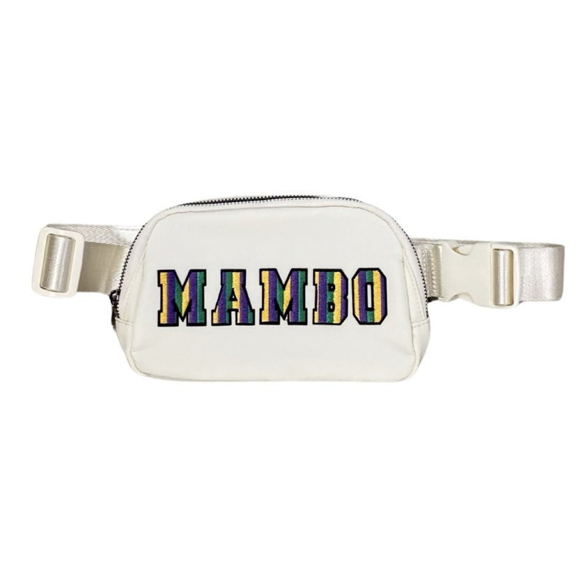 Off-white fanny pack with varsity style MAMBO letters in purple, green, and gold stripes. Zip closure. Adjustable band. 2 interior mesh pockets. 1 zip pocket on the back