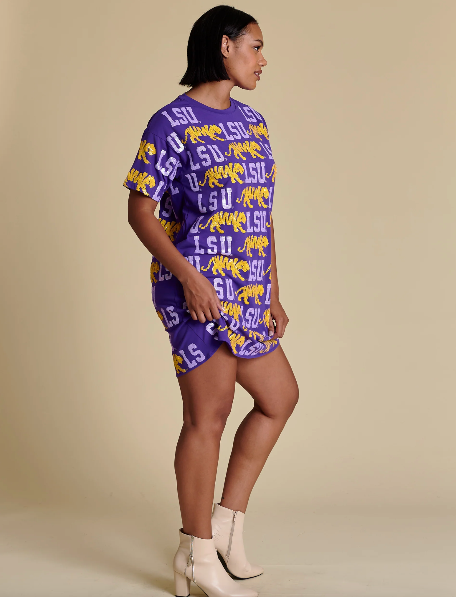 Purple and gold LSU sequin repeat t-shirt dress with tiger accents