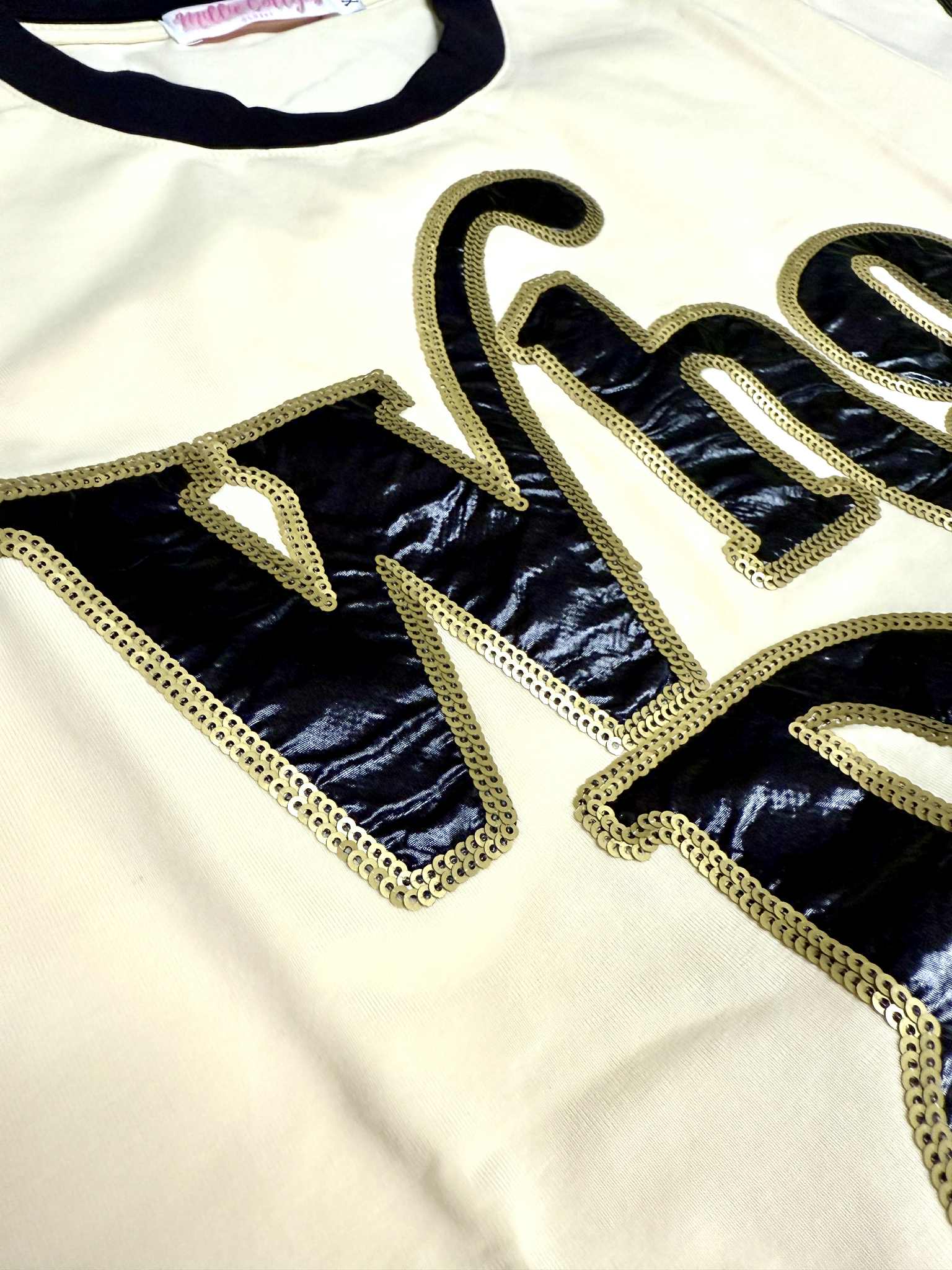 Light gold colored ringer tee with Who Dat and striped sleeves in black and gold sequin detail.